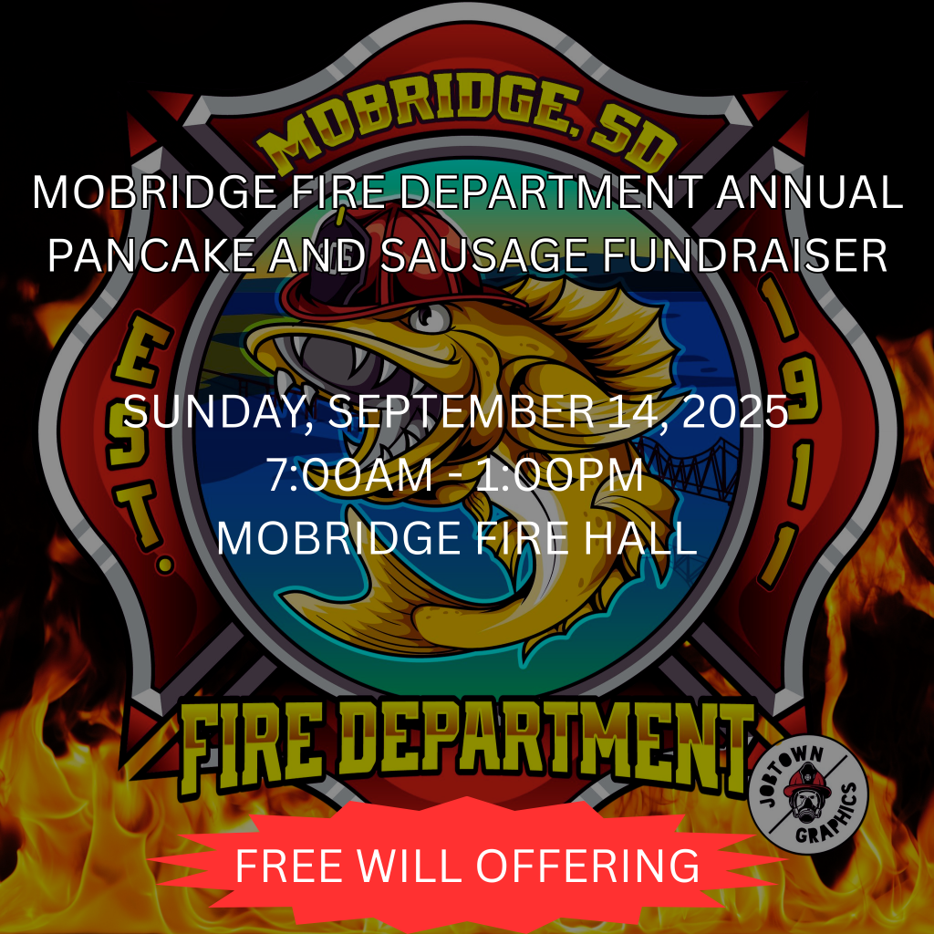 Head down to the Mobridge Fire Department located at 114 1st Avenue East, in Mobridge. We are hosting our Annual Pancake and Sausage Feed on Sunday, September 14th. Dine in or take out available upon request. Serving from 7:00 AM - 1:00 PM.