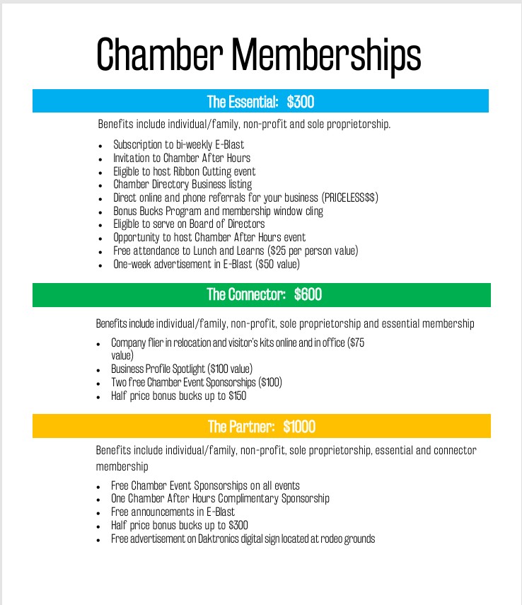 The 2026 Chamber Memberships is annual. Please find available member tiers and their benefits below: